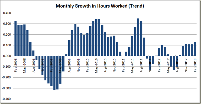 Not surprisingly this has meant that annual growth is now only just above the 10 year average. It’s still doing well – 3.1% is nothing to sneeze at – but the trend estimate really highlights the sense that the economy slowed down in the second half of last year. Also once the March 2012 quarter is left out of the annual growth figures (ie in the next lot of figures) then it’s likely we’ll see a drop.